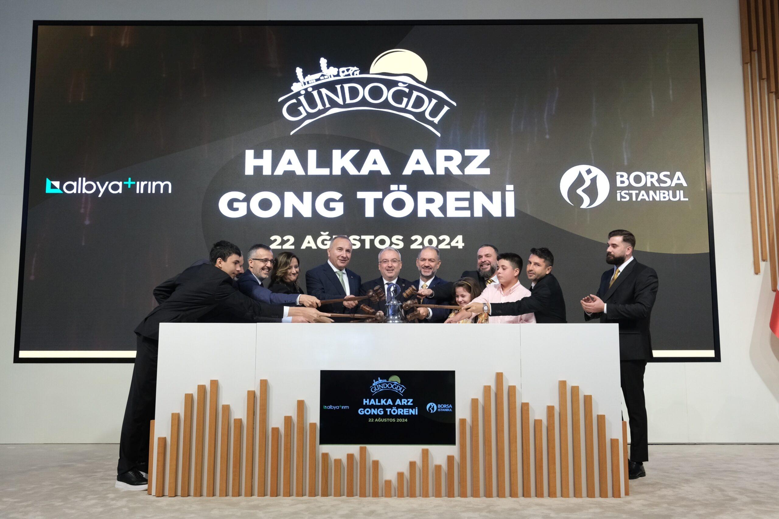 Geleneksel lezzetleri en sağlıklı şekilde dünyaya sunma misyonuyla hareket eden Gündoğdu Gıda Süt Ürünleri A.Ş., 22 Ağustos 2024 tarihinde Borsa İstanbul’da gerçekleştirilen gong töreni ile Ana Pazar’da ‘GUNDG’ kodu ile işlem görmeye başlamıştır. Bu anlamlı etkinlik, Borsa İstanbul A.Ş. Genel Müdürü Korkmaz Ergun, TOBB Yönetim Kurulu Başkan Vekili ve İstanbul Ticaret Borsası (İSTİB) Başkanı Ali Kopuz, İSTİB Meclis Başkanı Ahmet Bülent Kasap, Gündoğdu Gıda Yönetim Kurulu Başkanı Zülküf Kopuz, Gündoğdu Gıda Yönetim Kurulu Başkan Vekili Mustafa Kopuz, Gündoğdu Gıda Genel Müdürü Hakan Tokgöz, ALB Yatırım Yönetim Kurulu Başkanı Salih Albayrak, İSTİB yönetim kurulu üyeleri, Gündoğdu Gıda yöneticileri, ALB Yatırım temsilcileri ve çok sayıda davetlinin katılımıyla gerçekleşmiştir.