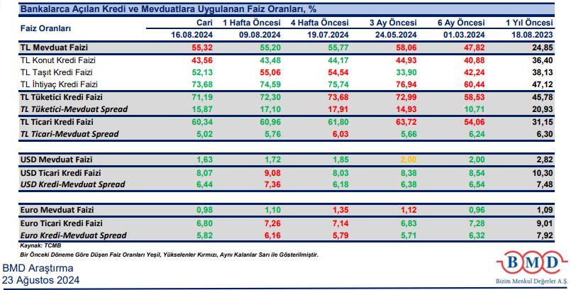 TL bazlı ticari kredilerin faiz oranı, aynı dönem içinde bir önceki haftaya göre 62 baz puan azalarak %60,34 seviyesine düşmüştür. Ayrıca, TL bazlı konut kredilerinin faiz oranı 8 baz puan artışla %43,56; taşıt kredisi faizleri 293 baz puanlık azalışla %52,13; ihtiyaç kredisi faizleri ise 91 baz puan azalışla %73,68 olarak gerçekleşmiştir.